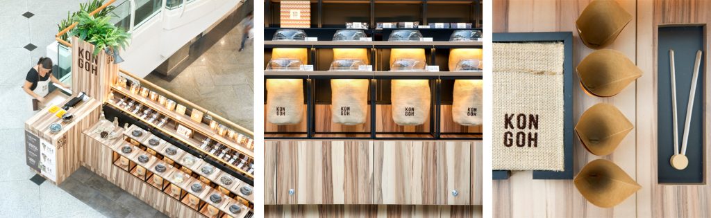 KONGOH es una tienda piloto ubicada en un centro comercial de Barcelona. Inspirada en los mercados africanos, establece un recorrido secuencial por los productos que el cliente puede servirse a sí mismo, incitando la compra por impulso.