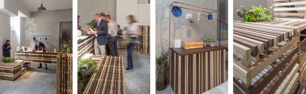 TULIP BAR, en Milan, fue un bar de zumos durante la Milan Desing Week de 2014. El mobiliario modular mutaba formando bancos, barras y el mostrador de atención, desdibujando la distinción entre el espacio de servicio y los clientes. El material utilizado fue pensado para poderse desmontado y reutilizado.