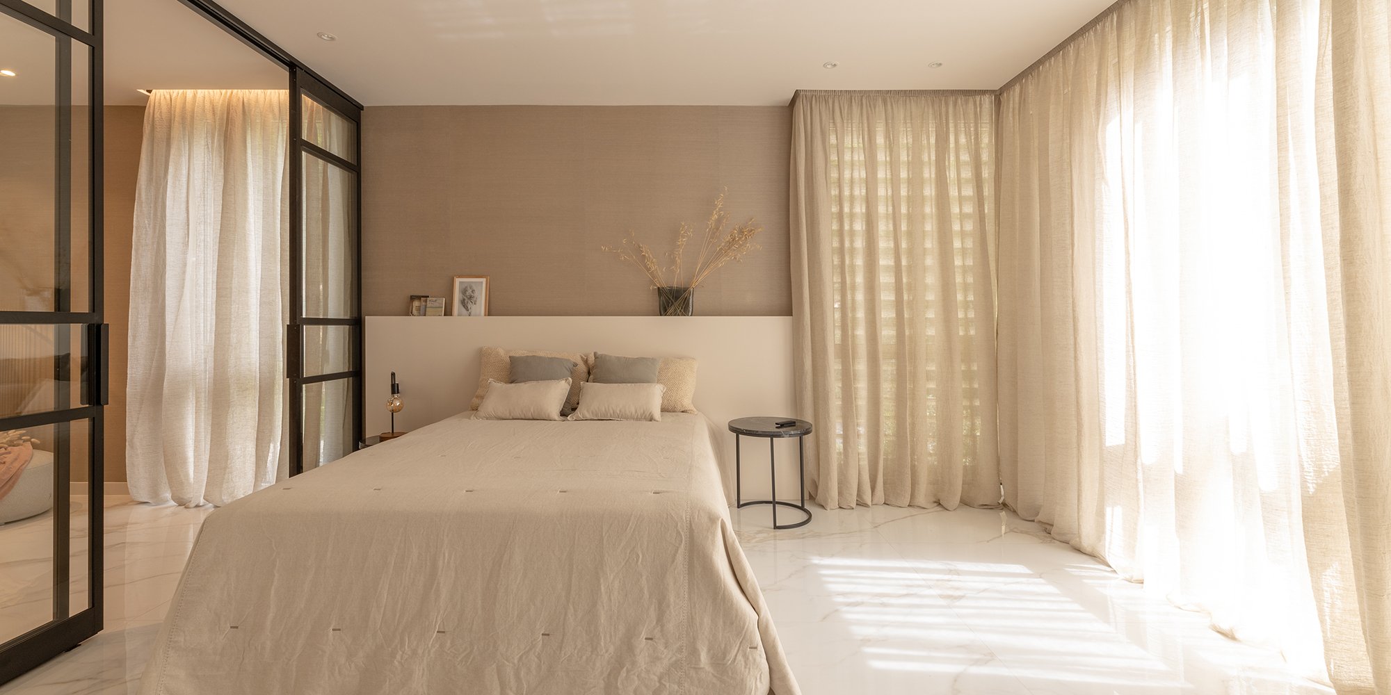 La zona del dormitorio presentaba la particularidad de disponer de una tribuna de ventanas con espléndidas vistas del jardín, que quedan enmarcadas por las románticas cortinas de lino natural. Por la noche, es posible bañar los tejidos con la luz cenital proyectada desde los cortineros, creando una atmósfera de calma.