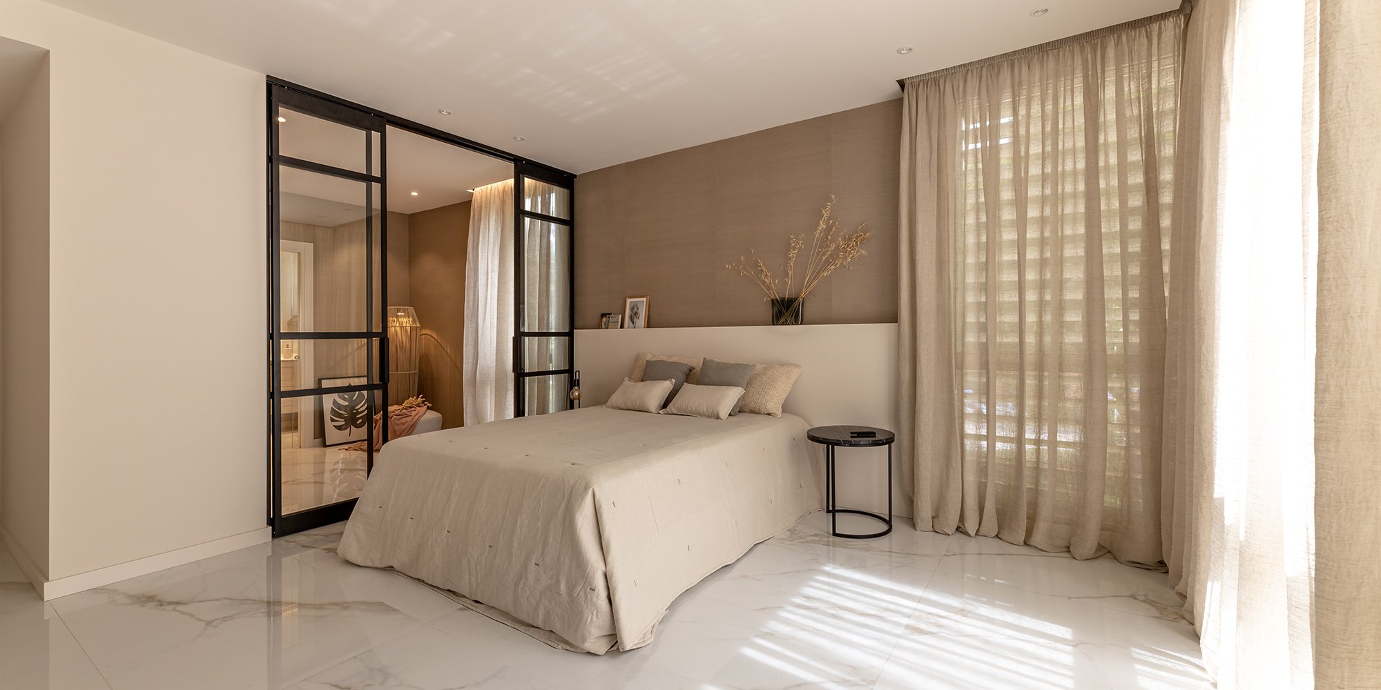 Uno de los espacios más impactantes es la Suite Principal de 34m². Para este diseño nos inspiramos en las suites de hoteles, ya que los espacios se van abriendo a medida que se accede a la estancia para favorecer la intimidad.